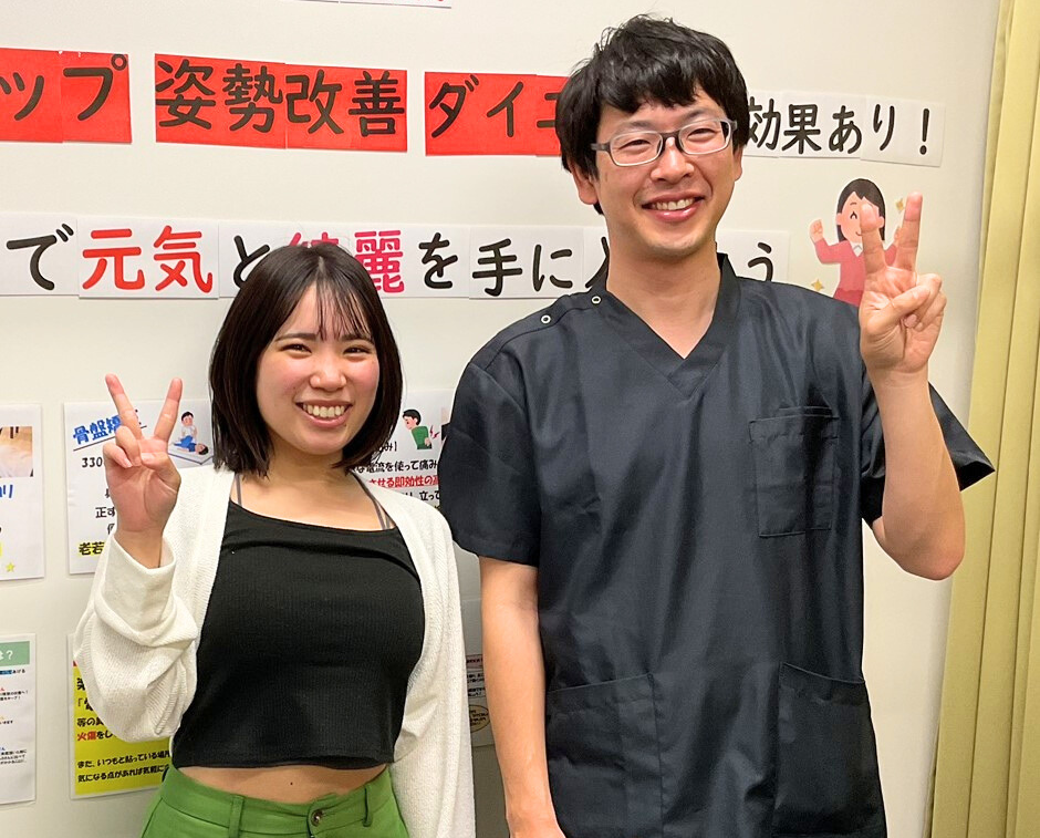 当日は痛みが強いからということで、電気治療をやっていただき、あれだけ痛かった痛みが魔法のように消えたのでびっくりしました。痛みが落ち着いてからは、腰痛が再発しないように身体の歪みを治してもらって今では仕事中に辛かった腰痛もほとんどでなくなりました。